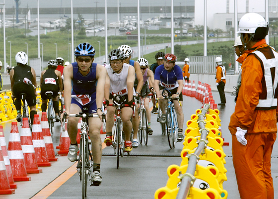 青空が広がる国道で、無線を使用して警備を行うのも私たちの仕事。交通渋滞や事故の発生を未然に防ぐため、車両や歩行者の誘導を行います。大切な役割ですが、どなたでも行えるようにトレーニングを行います。